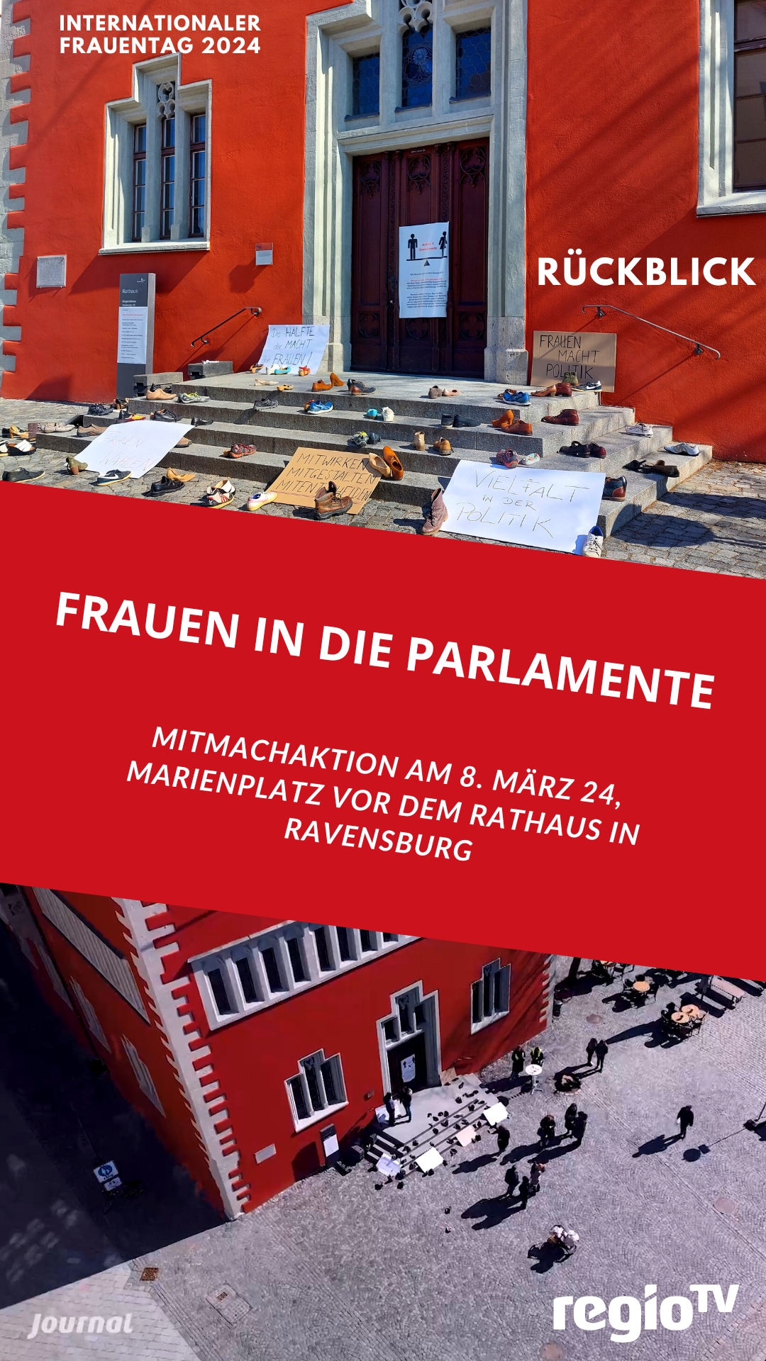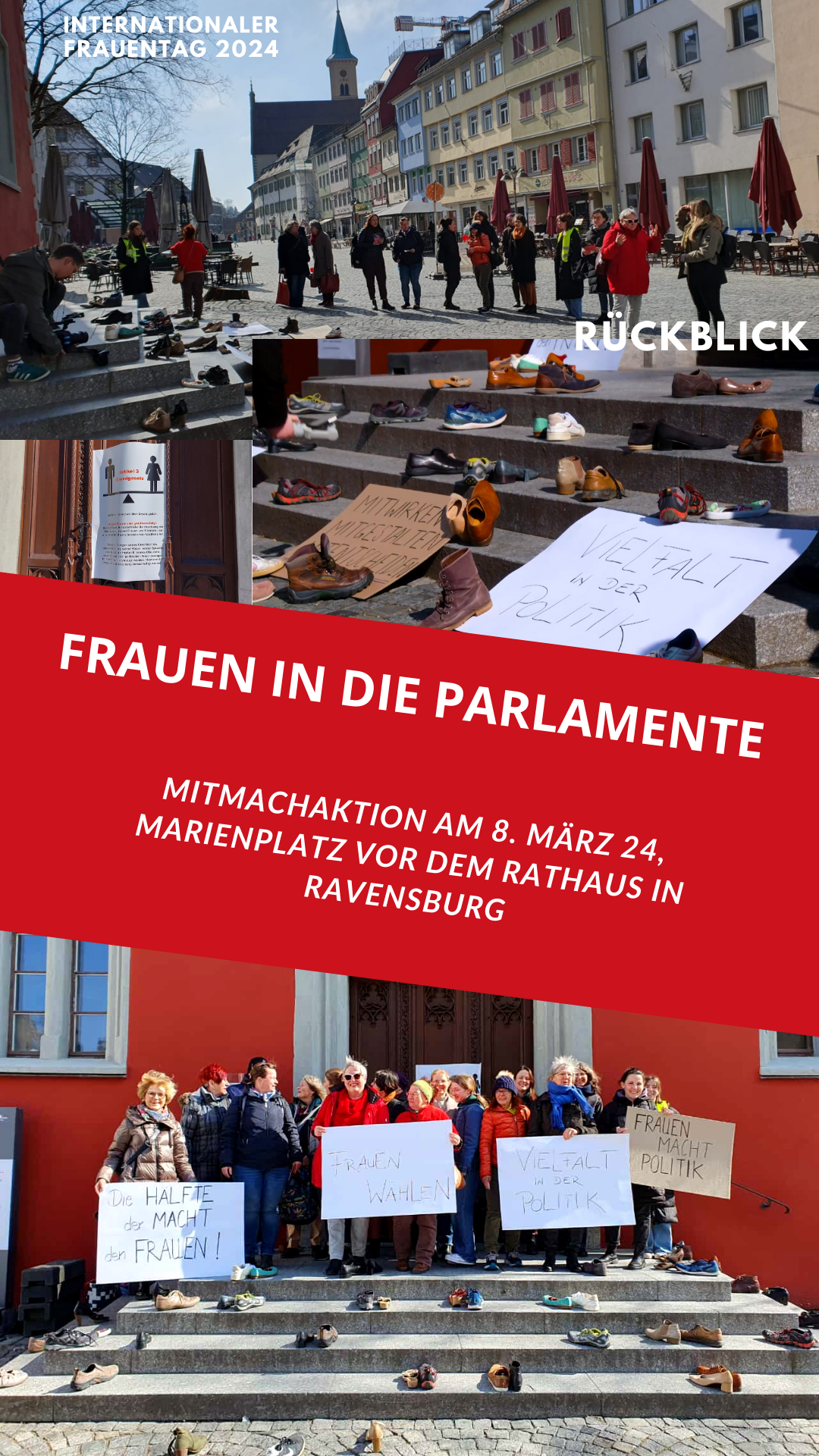 In Ravensburg lud das Bündnis Internationaler Frauentag Ravensburg zu einer Mitmach-Aktion auf dem Marienplatz vor dem Rathaus ein: Unter dem Titel „Frauen in die Parlamente“ wollten wir anlässlich der anstehenden Kommunal- und Europawahlen für die Erhöhung des Frauenanteils mit dem Ziel einer Parität in den Parlamenten werben. Alle waren eingeladen, ein gemischtes Paar Schuhe mitzubringen, bestehend aus einem Frauen- und Männerschuh. Die Schuhpaare vor dem Rathaus sollten dafür stehen, dass wir 50:50 in den Parlamenten fordern, die Hälfte der Macht den Frauen.