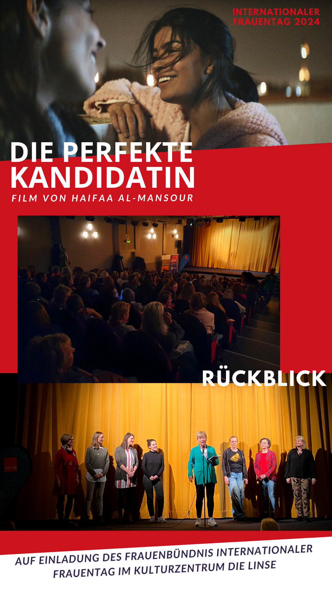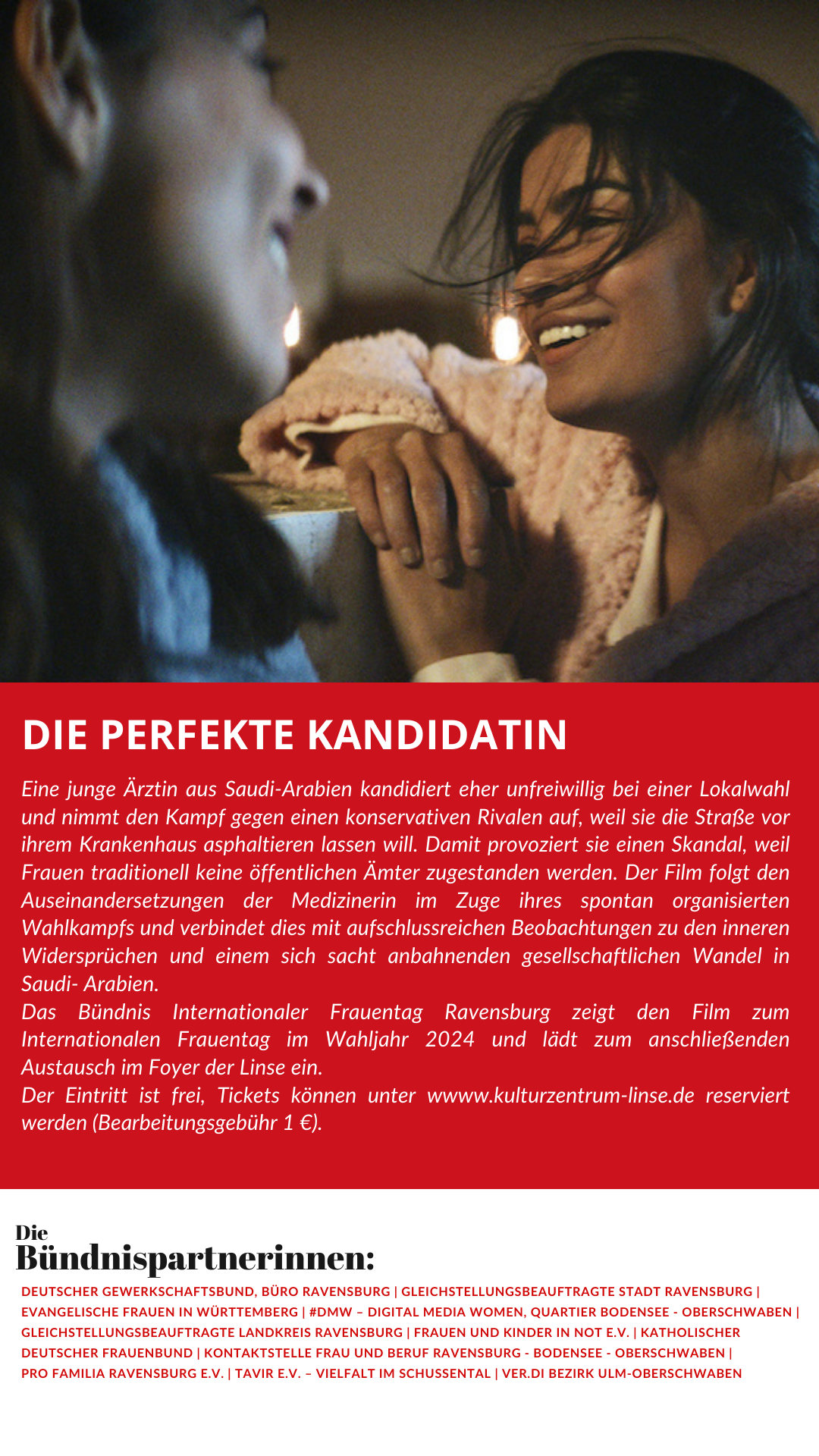 Am Abend zeigten wir in Kooperation mit dem Kulturzentrum Linse in Weingarten den Film „Die perfekte Kandidatin“ von Haifaa Al-Mansour, eine deutsch/saudi-arabische Koproduktion über eine junge Ärztin, die entgegen aller Konventionen für das Kommunalparlament ihrer Stadt kandidiert, um sich für die Asphaltierung der Straße zum Krankenhaus einzusetzen. Im Anschluss freuten wir uns über Begegnung und Austausch im Foyer.