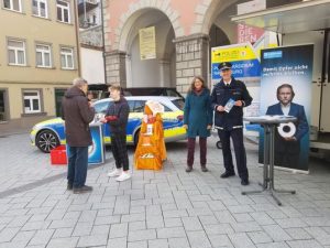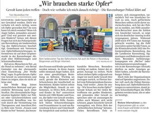 Am 16.10.2023, dem landesweiten Tag des Opferschutzes, waren wir gemeinsam mit der Polizei Ravensburg, dem Weißen Ring und Brennessel e.V. am Gespinstmarkt vertreten. Ziel der Veranstaltung war alle interessierten Bürgerinnen und Bürger über Hilfeleistungen und Schutzmaßnahmen zu informieren. Die Schwäbische Zeitung berichtete (19.10.2023).