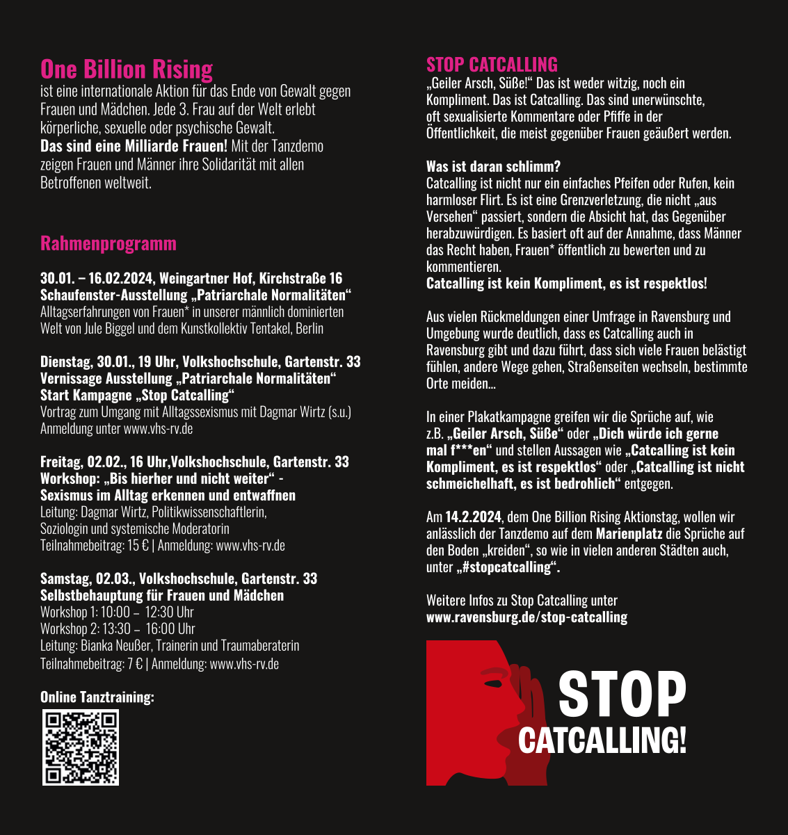 Wie immer boten wir auch zwei Selbstbehauptungsworkshops an für Frauen und Mädchen mit der erfahrenen Trainerin Bianka Neusser am 2. März. Schließlich waren Sie und alle eingeladen zur Tanzdemo am 14. Februar um 17 Uhr auf dem Marienplatz. Tanztrainings boten wir online oder am 06.02. in der Tanzschule Geiger an.