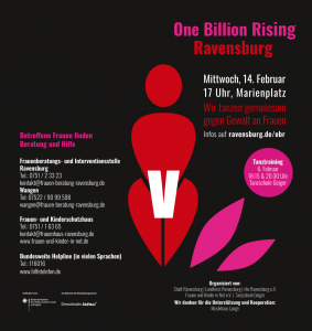 One Billion Rising – Aufstehen gegen Gewalt an Frauen und Mädchen ist eine jährlich am 14. Februar stattfindende Aktion zur Solidarität mit allen Betroffenen. Sie erinnert daran, dass weltweit jede 3. Frau von körperlicher, sexueller oder psychischer Gewalt betroffen ist, das sind 1 Milliarde Frauen (engl.: one Billion).