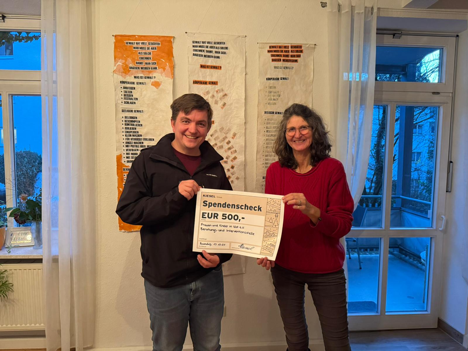 Natürlich über den schönen Geldbetrag, der unsere Aufgaben in Frauen- und Kinderschutzhaus und Beratungsstelle mit absichert. Genauso aber auch darüber, dass viele Mitarbeitende Gewalt gegen Frauen und Kinder als nicht hinnehmbares Problem betrachten und die Notwendigkeit unserer Arbeit bestätigen. Ganz herzlichen Dank an die Firmenspitze für den Vorschlag und die wertschätzende Begegnung bei der Spendenübergabe!