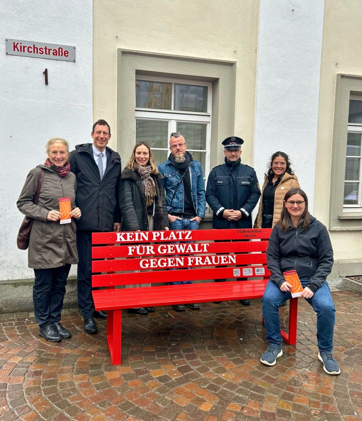13 signalrot gestrichene Holzbänke werden in den kommenden Wochen und Monaten im Landkreis Ravensburg aufgestellt – alle haben eine klare Botschaft: Hier ist kein Platz für Gewalt gegen Frauen. Das Projekt ist auf Initiative des Vereins Frauen und Kinder in Not e.V., der Polizei Ravensburg sowie der Gleichstellungsbeauftragten der Stadt Aulendorf und des Landkreises Ravensburg entstanden. Die Farbe Rot steht symbolisch für Blut und Gewalt, neben dem Slogan „Kein Platz für Gewalt gegen Frauen“ ist die Telefonnummer des Hilfetelefons 116016 zu finden.